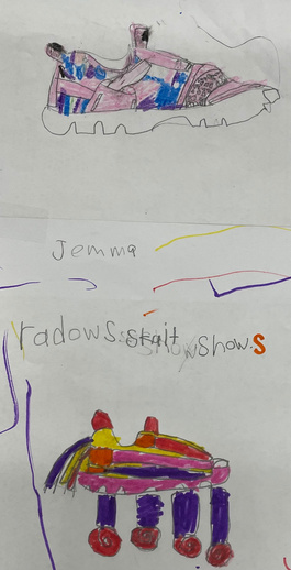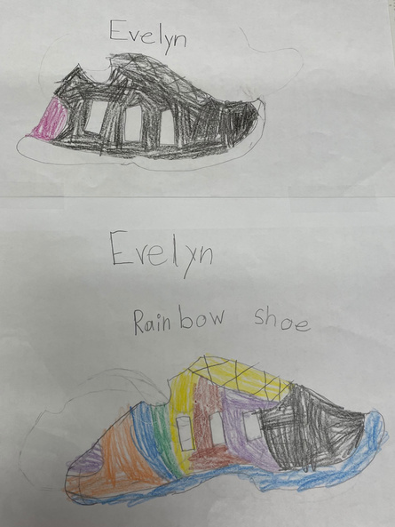 Students used observation to draw their own shoe, basic STILL LIFE. They were then asked to create their own future design knowing what a shoe looks like. There were incredible innovations! We also studied ABSTRACT Art. We completed our LINE and SHAPE unit with crumpled paper line trace. This is easily done at home! FORM was our next unit, turning boring, flat paper into 3-D FORM! The cat sculpture allowed students to see the difference in 2D and 3D. We are now working on Color Schemes...