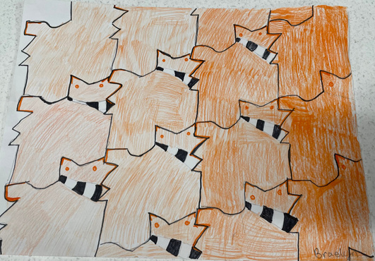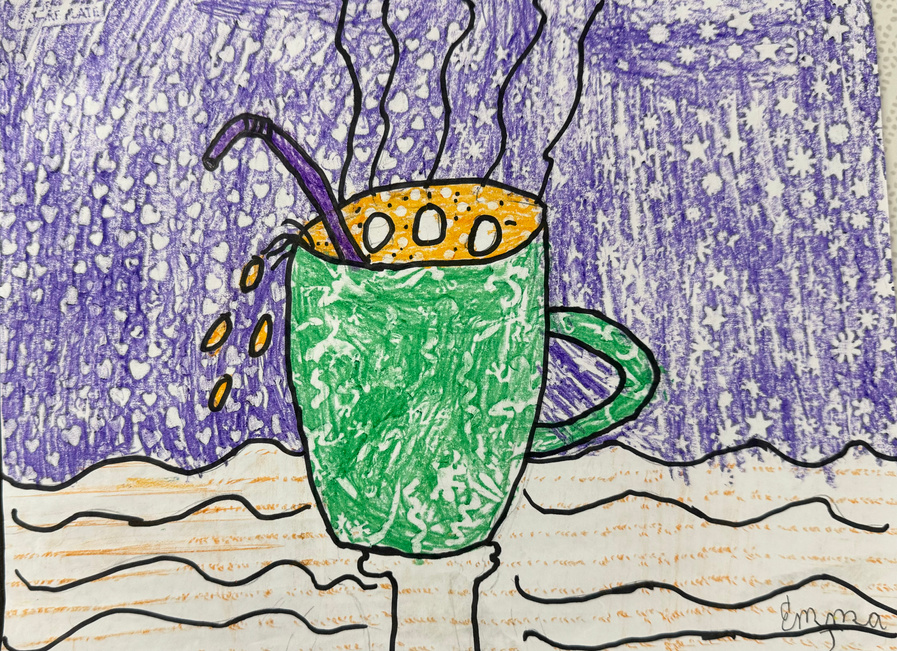 Fifth graders created tessellations in their own unique shapes. They used their imaginations to find something in the pattern while adding detail. Students then started COLOR unit. We talked about the color wheel and color theory-placement of colors on the color wheel has specific significance. ANALOGOUS colors are next to each other on color wheel- creating harmony. We made a cup of cocoa in analogous scheme adding TEXTURE.
